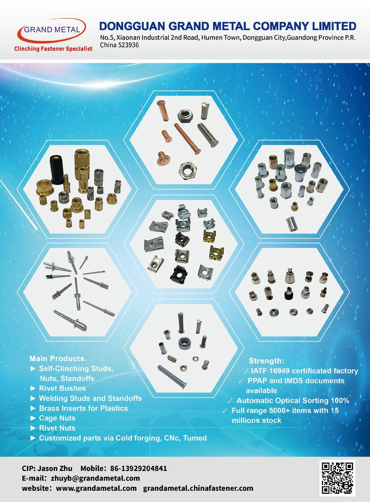 Grand Metal produces self-clinch nuts, standoff, studs equivalent to PEM standard, rivet nuts, weld studs, cage nuts, brass inserts and customized parts for CNC and cold forging, 200 millions stock, 5000+ items, PPAP and IMDS for automotive industry, IATF 16949 certificated . Most quotation can be obtained within 24-48 hours, with samples usually available within one week.