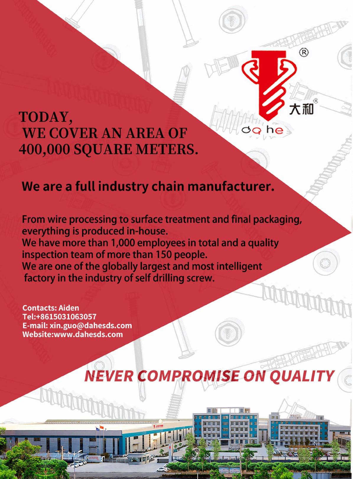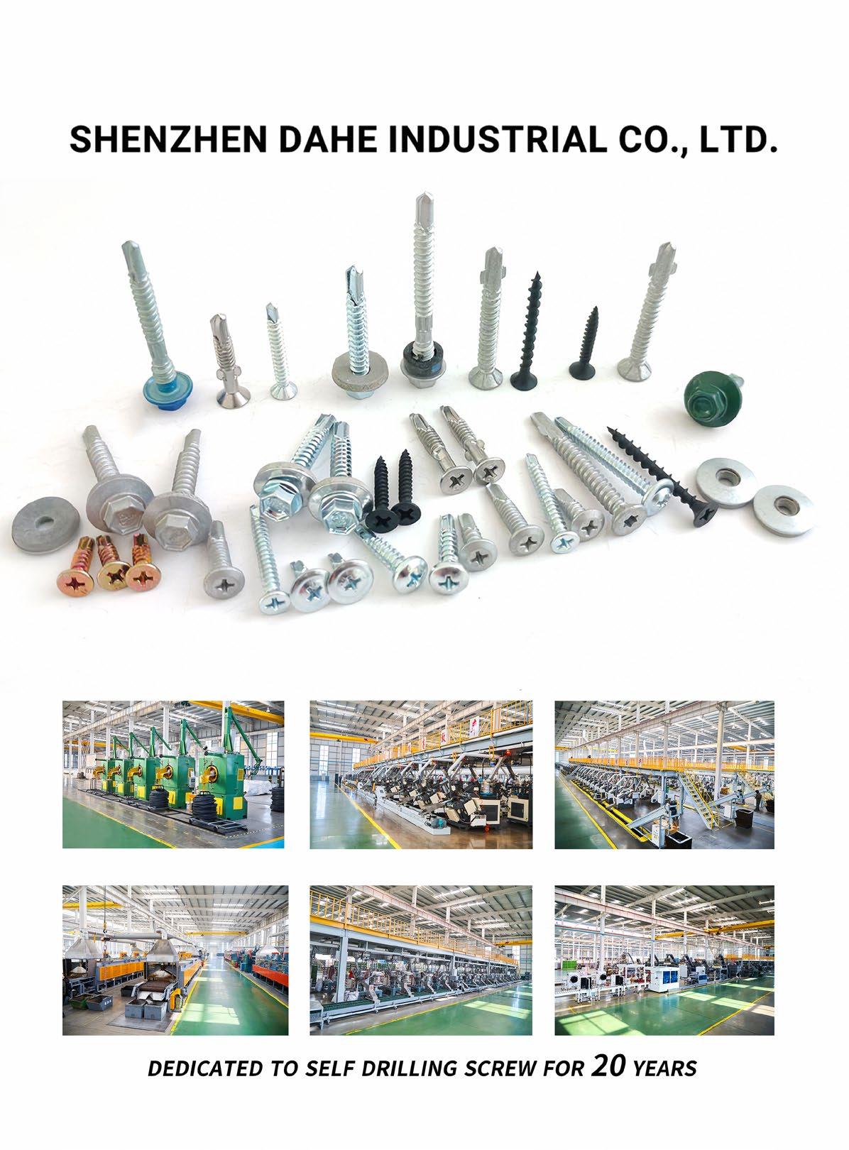 Shenzhen Dahe Industrial Co., Ltd. is the world's largest self-drilling screw manufacturer. The factory covers an area of 400,000m². It is a fullindustry chain manufacturer with ISO9001 quality management system and CE certification system. The company is positioned in the global mid-to-high-end market and is well-known in the industry for its quality.