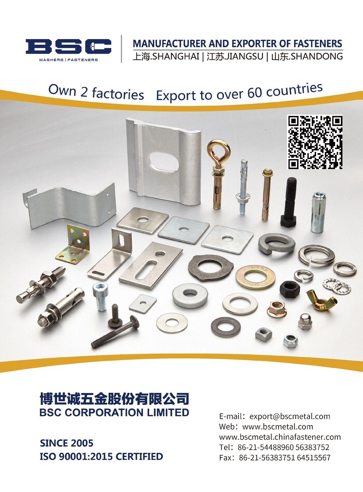 Established in 2005, BSC Corporation Ltd. is a reliable manufacturer and exporter of washers and other fasteners, with two factories which located in China's Jiangsu and Shandong, we not only produce the washers, anchors and stamping parts, also export other fasteners, our products have been exported to more than 60 countries.