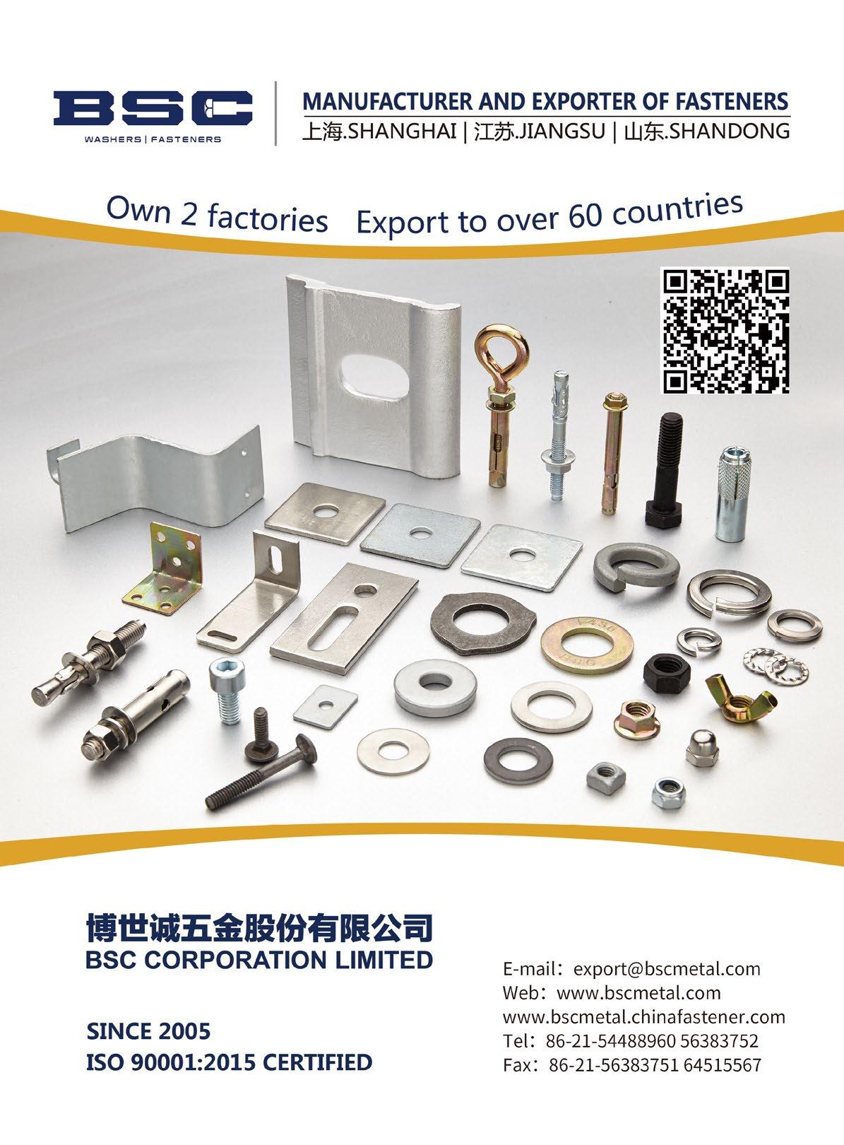 Established in 2005, BSC Corporation Ltd. is a reliable manufacturer and exporter of washers and other fasteners, with two factories which located in China's Jiangsu and Shandong, we not only produce the washers, anchors and stamping parts, also export other fasteners, our products have been exported to more than 60 countries.
