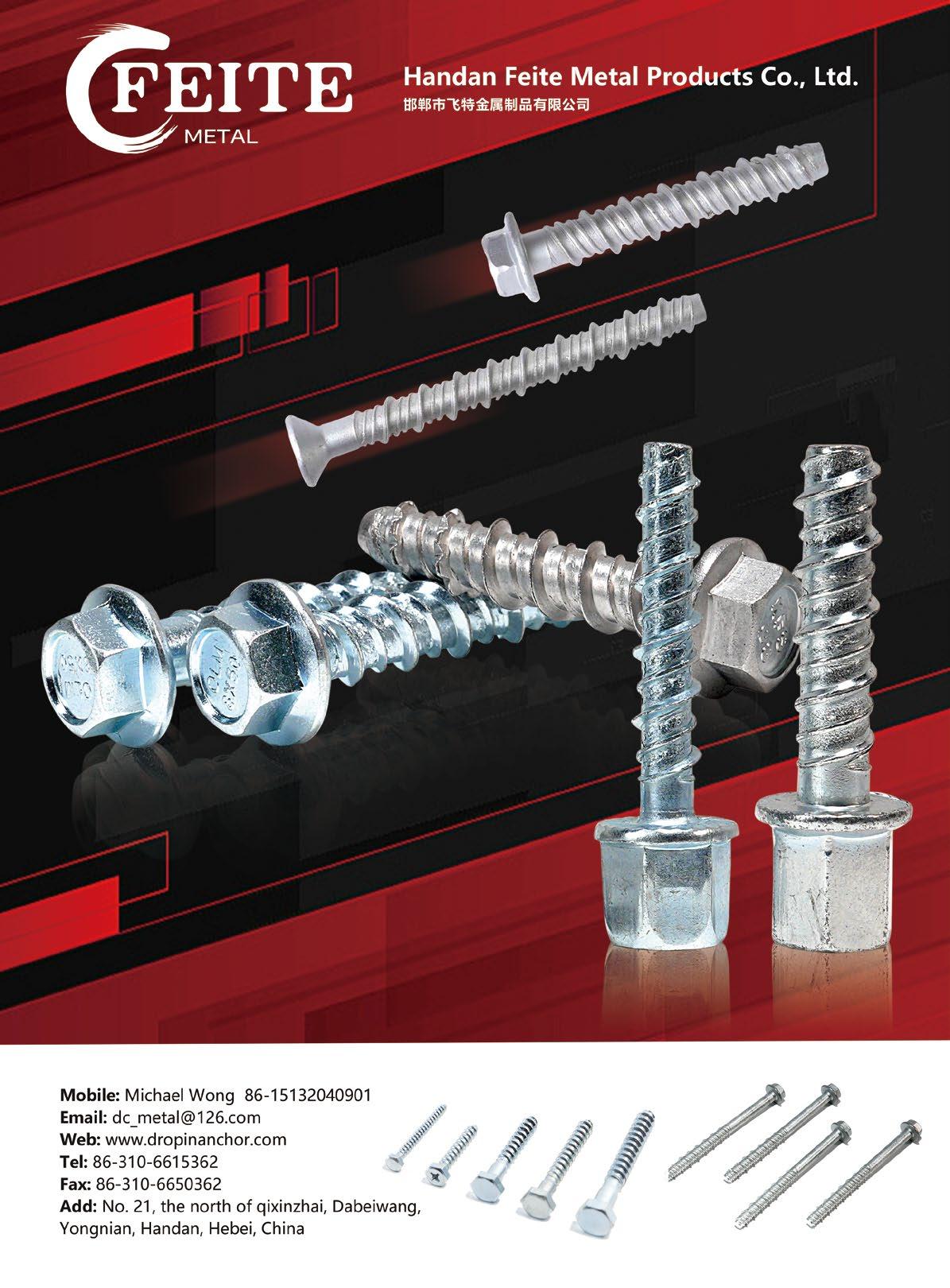 Handan Feite Metal Products Co., Ltd. integrates production and sales, renowned for its highquality products and timely delivery. The company specializes in manufacturing hexagon flange concrete cement self-tapping self-cutting anchor bolts, elevator expansion screws, wedge anchors, British/American standard carriage bolts, British/ American standard hex bolts and flange bolts, spring nuts, stamping products, and also offers customized production services.