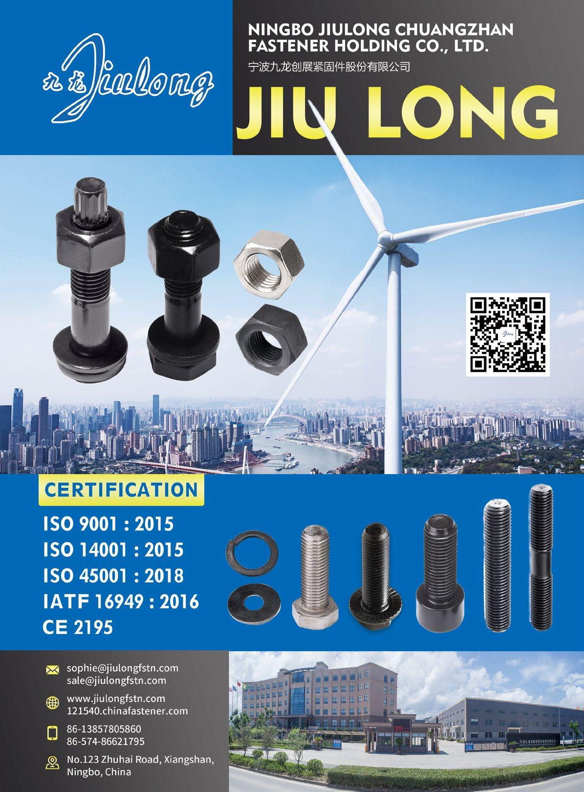 Ningbo Jiulong Chuangzhan Fastener Holding Co., Ltd. is an enterprise specializing in the production, research & development, sales, and technical service of high-strength fasteners. The products, including hexagon bolts, socket head screws, studs, hexagon nuts, welding studs, other high-strength fasteners, and non-standard fasteners made according to the drawings, are widely applicable in metallurgy, power, petrochemical industries, large span steel structure factories, high-rise buildings, wind power generation, railway bridges, cross-sea bridges, subways, oil refineries, etc. The company has passed the ISO9001:2015 Quality Management System, IATF 16949:2016, ISO14001:2015, and ISO45001:2018 certifications. All products adhere to the standards of GB, ISO, EN, DIN, ASME, JIS, BS, and other international standards.