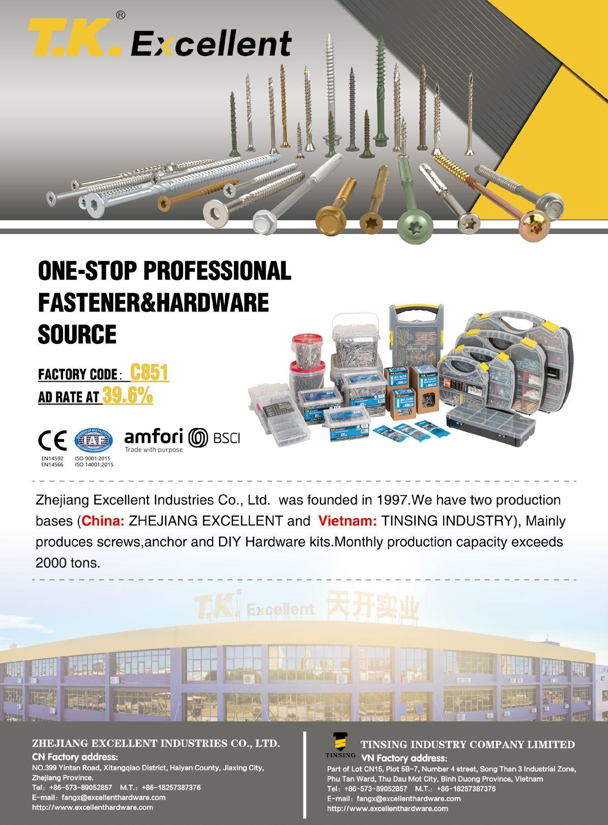 Zhejiang Excellent Industries Co., Ltd. was founded in 1997. We have two production bases (China: ZHEJIANG EXCELLENT and Vietnam: TINSING INDUSTRY), mainly producing screws, anchors and DIY Hardware kits. The monthly production capacity exceeds 2000 tons.