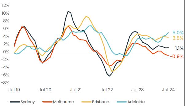 CoreLogic’s most recent ‘Monthly Housing Charts’ for August 2024 (see below chart) show that residential property prices across Australia’s capital cities have risen by 1.8% over the past quarter, while also rising 7.6% over the past 12 months.