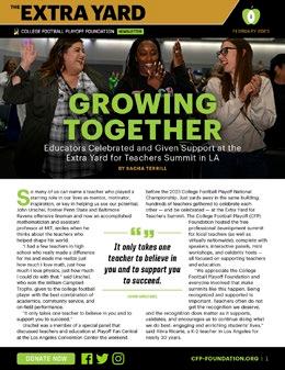 Three years ago, the Big Day for Teachers was added during Extra Yard for Teachers Week as a singleday concerted effort of community impact across the extended college football family. Millions of dollars in investments are announced that day, and thousands of people support teachers in multifaceted ways. Grants are announced, finalists for the National Teachers Hall of Fame are highlighted, and student-athletes and coaches surprise teachers and tell stories of the impact those educators have made.