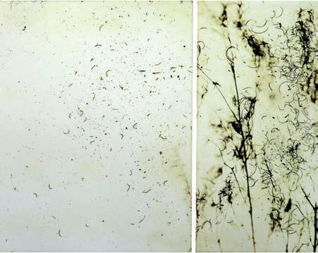 pressure. Through the process of printmaking, she explores the potential of multiplicity and the opportunity to enlarge drawn marks. The weight or indentation of the surface upon which she works is important to heras an anchor or embrace of the intangible sounds observed.