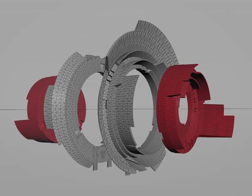 Opposite: Exploded 3D mesh showing the four print components of 20 GOTO 10 sculpture #3. SideFX Houdini viewport render.