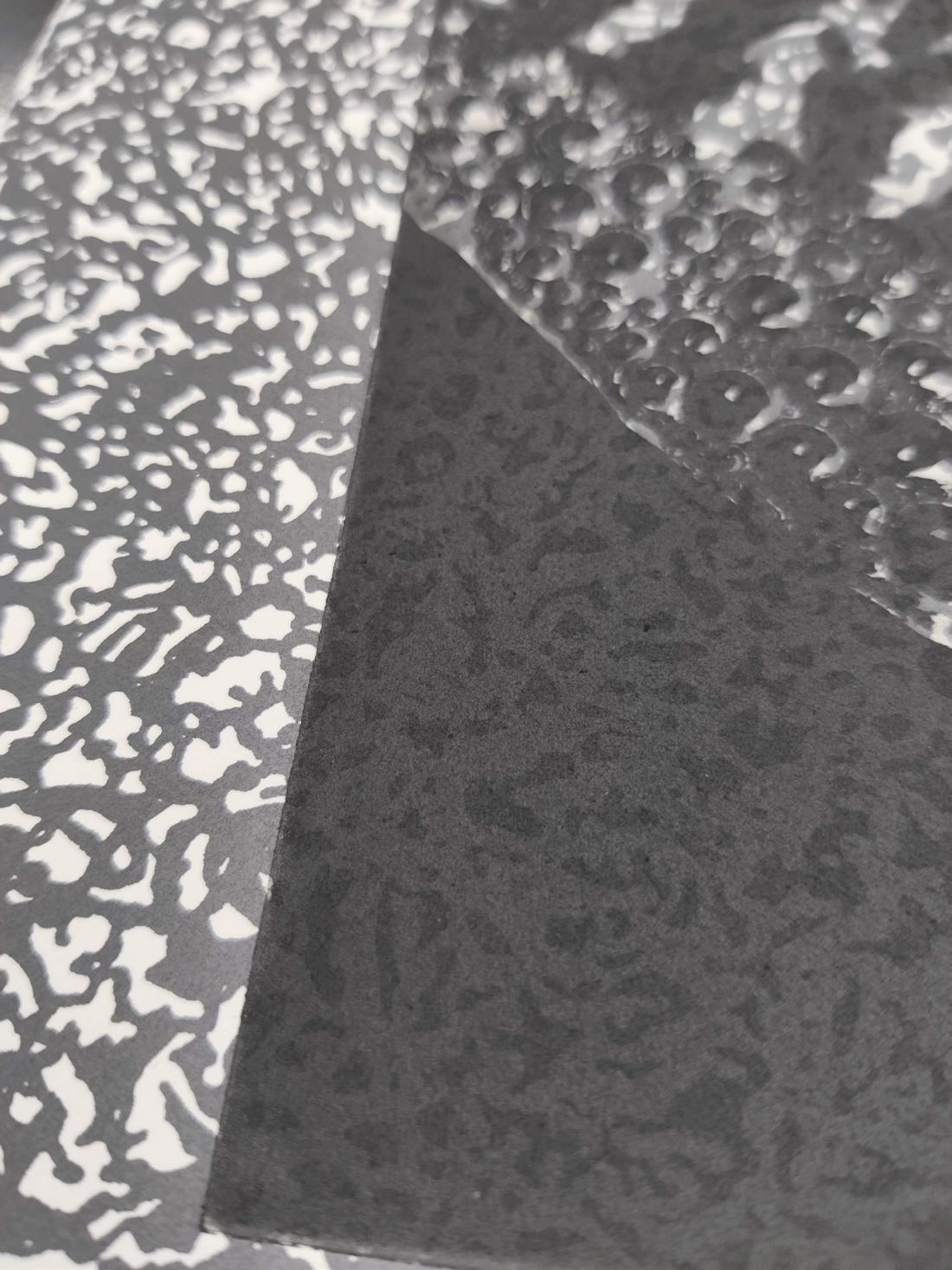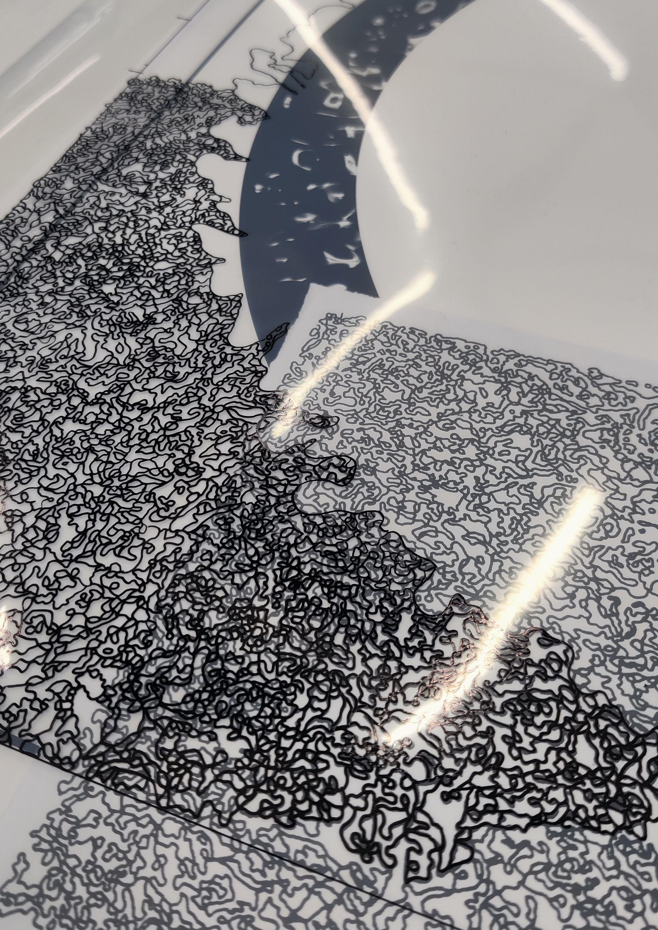 The expanded facilities and the specialist knowledge of technical staff at CFPR and musician Phil Phelps, enabled me to integrate and incorporate new processes and materials into my practice. Through conversation and knowledge exchange the traditional processes of screenprinting and intaglio were expanded to accommodate innovative materials such as graphene, lasercut wood and solar photogravure.