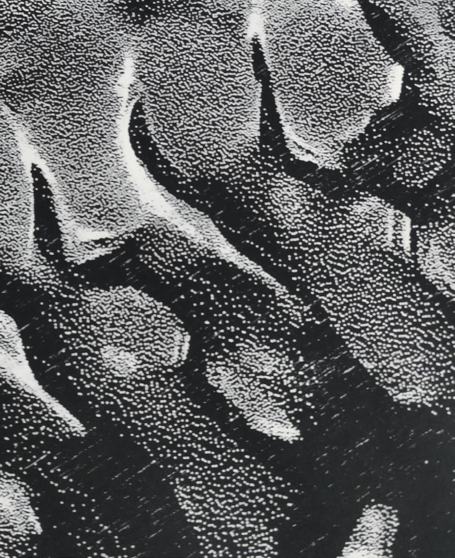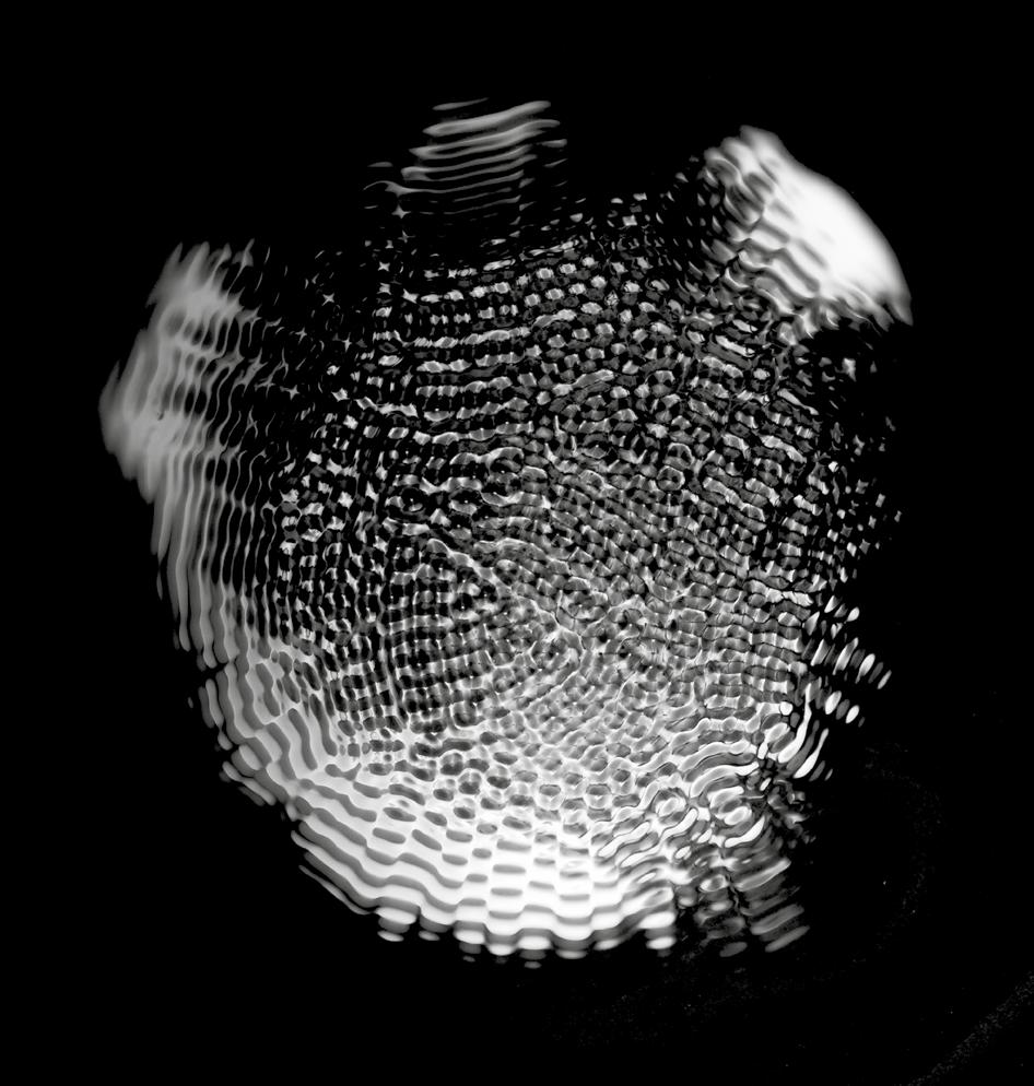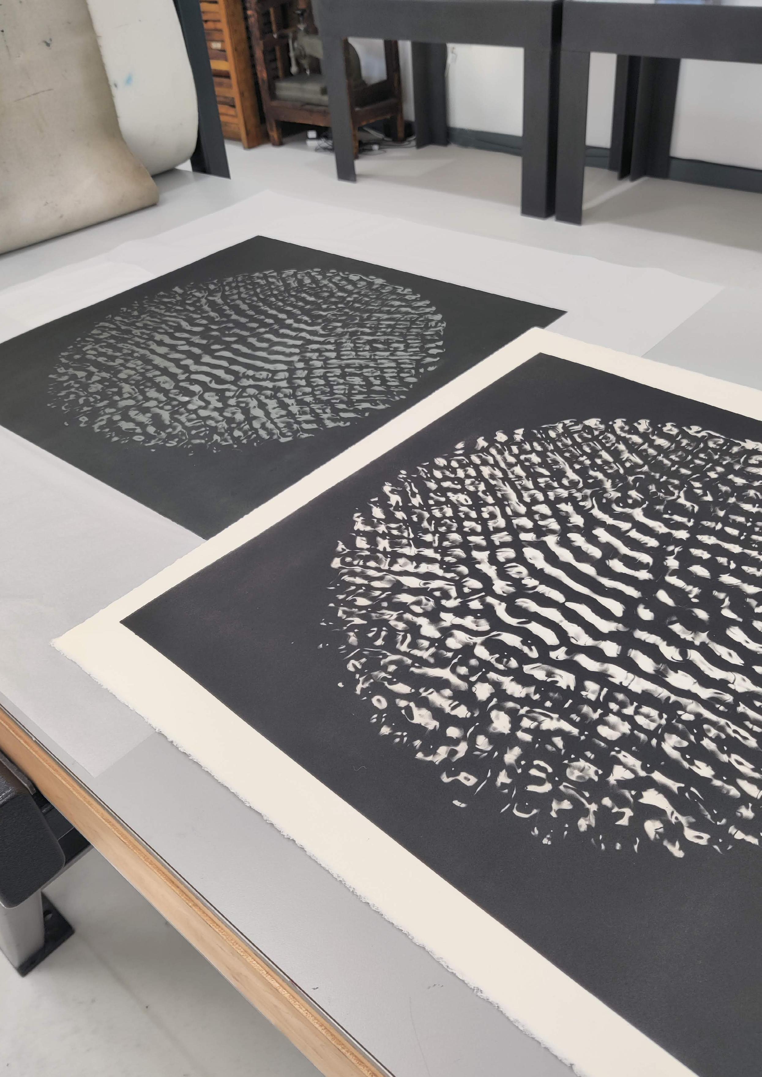 By working with Cymatics and photography the edition image evolved beyond the materials. The resulting images forced a change in my approach. To preserve the rhythmic velvet patterns and sensory flow of the captured liquid sound it was necessary to move away from woodblock, as initially planned, to photogravure. Traditional hand printing would combine both screen and intaglio layers making visible the unseen structures and material presence in a physical process of exchange.