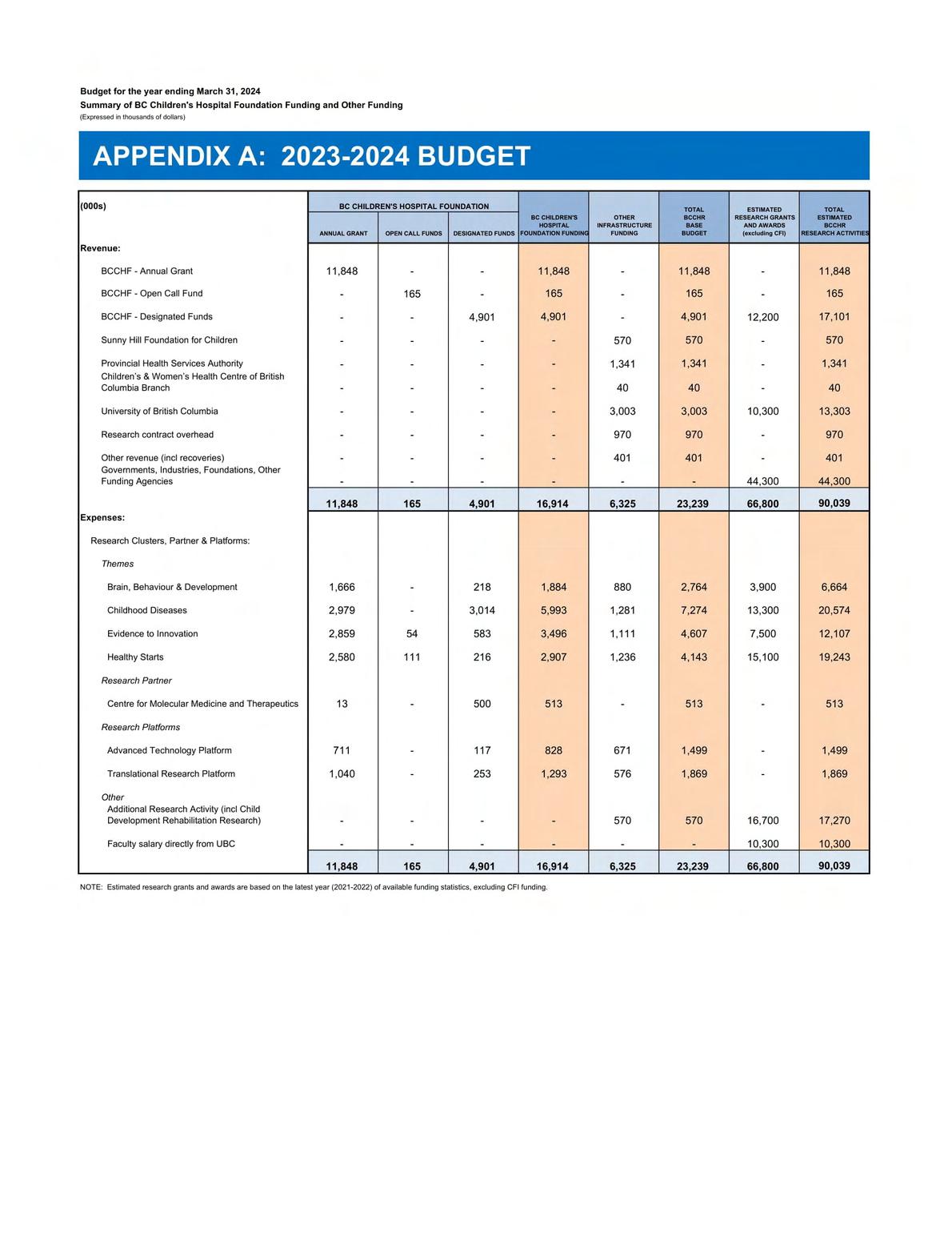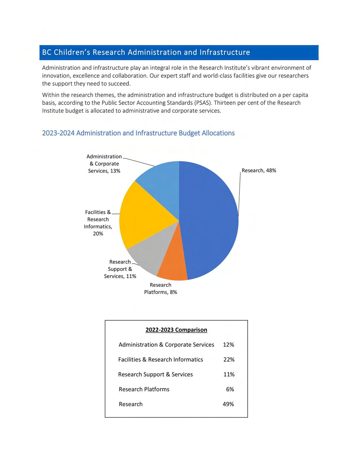 The Research Institute follows the Canadian Public Sector Accounting Standards (PSAS) and as such, the 2023-2024 Annual Grant allocation to research themes, research partners and core platforms includes investigators' salary and establishment support, as well as administration and infrastructure support.