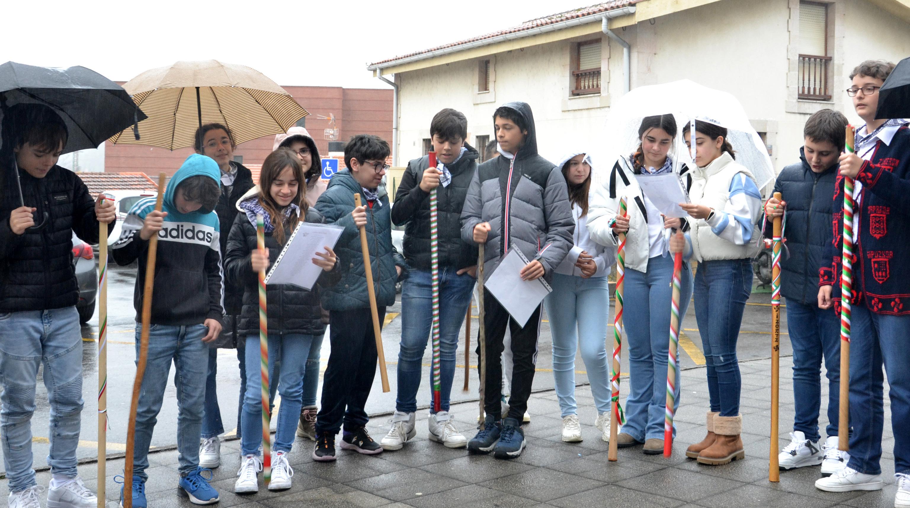 Deunari buruzko historia landuz. Euria zela eta, ibilbidea laburtu behar izan zen. Beraz, zentroan eta Meatzari plazan abestu zuten. Abestearen eta gogotsu ibiltzearen sari moduan txokolatea hartu zuten San Juaneko ikasleekin.