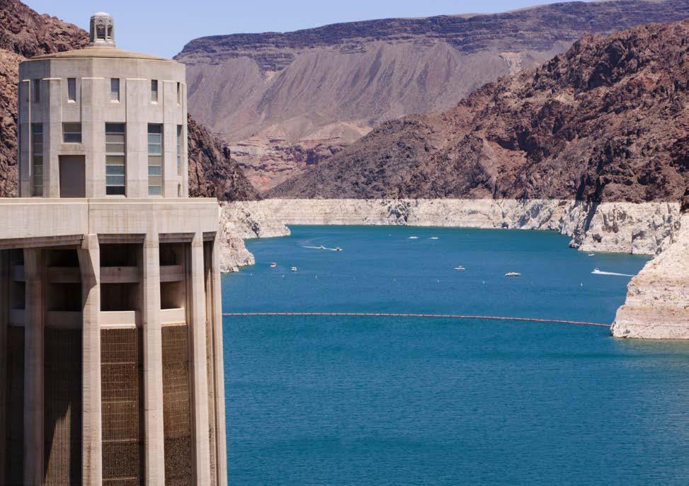 Hoover Dam is 726 feet high and located in the Black Canyon of the Colorado River on the border between Nevada and Arizona. Behind it is Lake Mead, the nation’s largest reservoir. As of February 2016, Lake Mead was 40 percent full. © Shirley Kilpatrick / Alamy Stock Photo