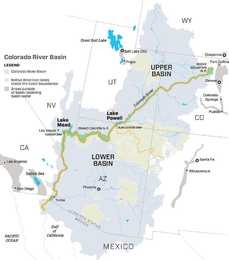 The Colorado River rises in the Rocky Mountains and flows, along with its tributaries, southwest, covering nearly 250,000 square miles through Wyoming, Colorado, New Mexico, Utah, Arizona, Nevada, and California before entering the Mexican states of Sonora and Baja California and emptying into the Gulf of California. It provides drinking water for about 40 million people, including those in the major metropolitan areas of Denver, Phoenix, Tucson, Las Vegas, Los Angeles, and San Diego. More than 70% of the river’s water is used to irrigate about 4.5 million acres of farmland, generating some 15% of the United States’ food.