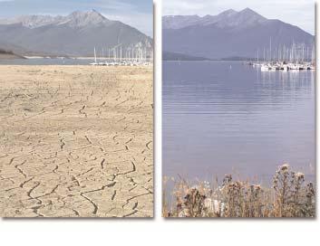 Dillon Reservoir photographed in August 2002 (left) and August 2003 (right). Dillon is the largest water storage facility in the Denver Water system.