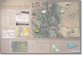 Recently revised, the Colorado: the Headwaters State poster provides an eyecatching summary of the major surface waters in the state, including lakes, reservoirs and rivers. Illustrations show how precipitation varies across the state, from less than 12 inches on the plains to more than 45 inches in the mountains. Other graphics trace the state’s history of drought and flood over the last 100 years. Statewide water use percentages show how water is divided between agriculture, commerce and industry, municipal, and other uses. Non-consumptive uses of water such as recreation and aquatic habitat are also highlighted. This attractive 24"x 36" wall hanging makes a useful addition to any business, school, or office – showcasing the beauty of our state and illustrating important water facts and figures in an accessible and easy-to-read format. In honor of the inaugural issue of Headwaters magazine, these posters are FREE with your order (plus shipping and handling).