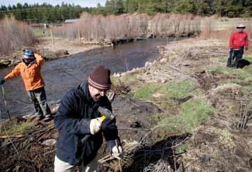John Giordanengo (center,) Liz Kellogg (left) and Linard Cimermanis plant willows on the banks of Tarryall Creek at Puma Hills River Ranch in Park County.