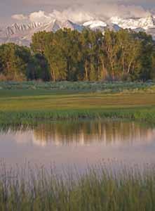 Armed for the job, John Giordanengo, projects director with Wildlands Restoration Volunteers, searches for soft soil to backfill around willow cuttings planted along Tarryall Creek by a volunteer crew. The native willows will protect eroding streambanks and enhance the riparian area on the privately-owned Puma Hills River Ranch, where the original willow communities were cleared for hay and cattle operations. Inset: The Red Lady Bowl of Mount Emmons lights up at dawn beyond the Snake River, which is joined by Coal Creek near the town of Crested Butte.
