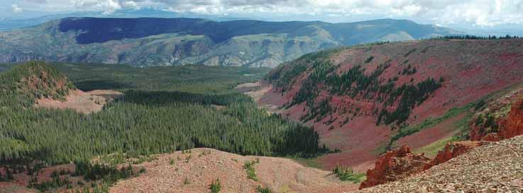 various proposals. Consider Red Table Mountain, a long ridge of sandstone nudging 12,000 feet and apparent to I-70 travelers south of Gypsum. On the north side, creeks tumble under a tight canopy of spruce and fir trees. The land arches steeply, and if taking a hike, you might call it nasty. Saws have been rare, trails and roads remain few. Red Table Mountain is wilderness with a lower-case “w.”