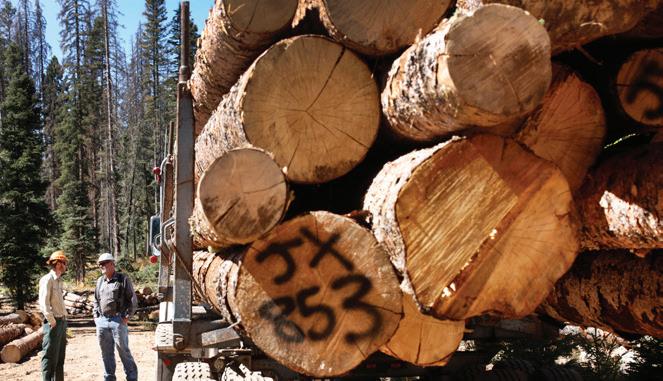Andy McCoy, owner of Cascade Timber Salvage, talks with a timber sale administrator with the San Juan National Forest in Southwest Colorado. The timber industry can help thin forests and clear trees, putting them to use and selling them, while reducing the risk of intense fire.