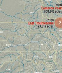 THE WILDFIRE AND WATERSHEDS ISSUE Colorado’s wildfire season is a summer norm, but wildfires have grown more frequent, intense, large and destructive. The 20 largest recorded fires in the state’s history have all burned since 2000, with the three biggest ignited in 2020. After a burn, debris, chemicals and vulnerable soils can result in contaminated water and emergency flooding, debris flows and mudslides—all of which occurred after the 2020 fires. As Colorado’s communities and watersheds recover from the megafires of 2020, they’re learning, developing resources, and applying more resources than ever to forest health work. With wildfires projected to increase in the future, will Coloradans be better prepared to live with fire?