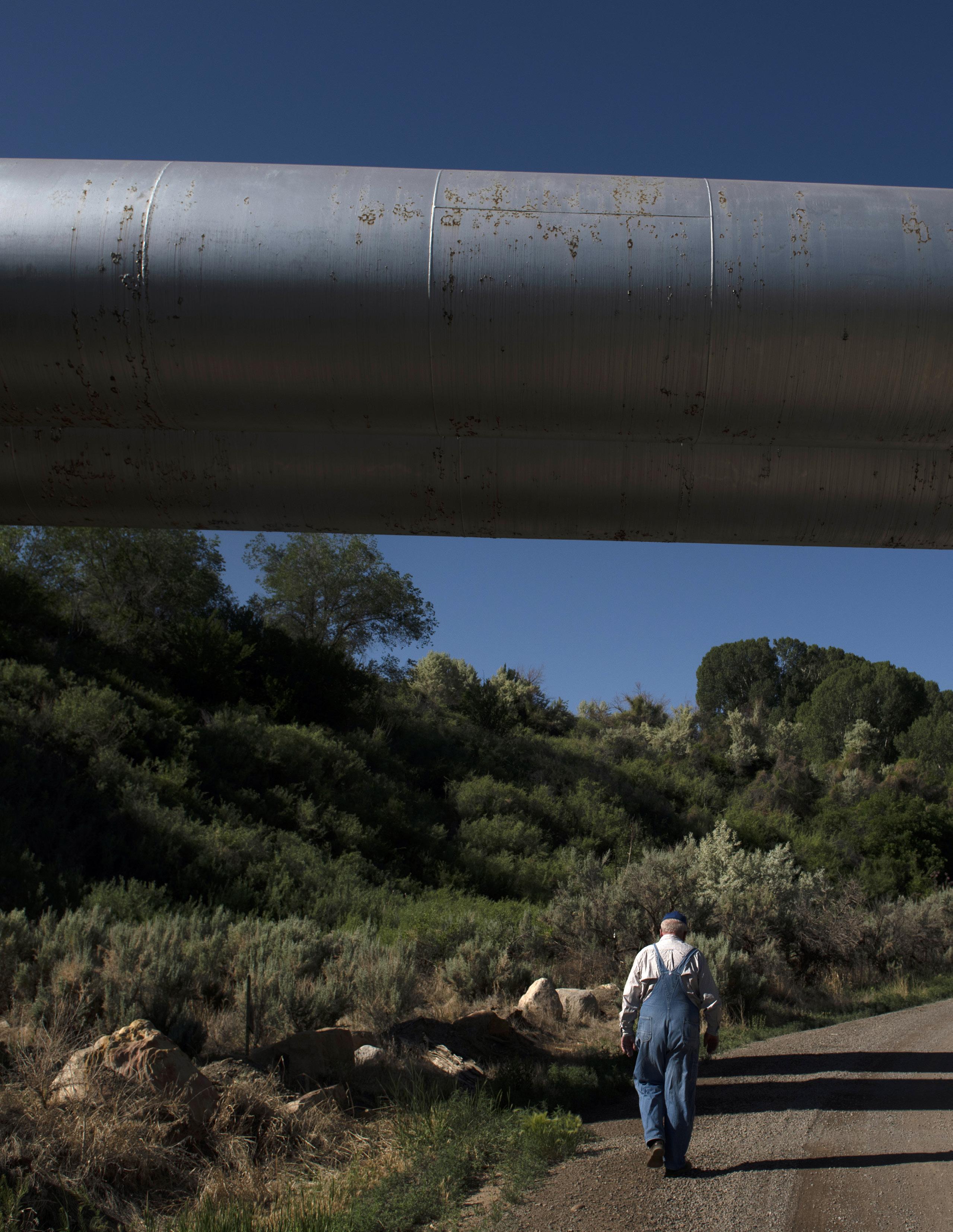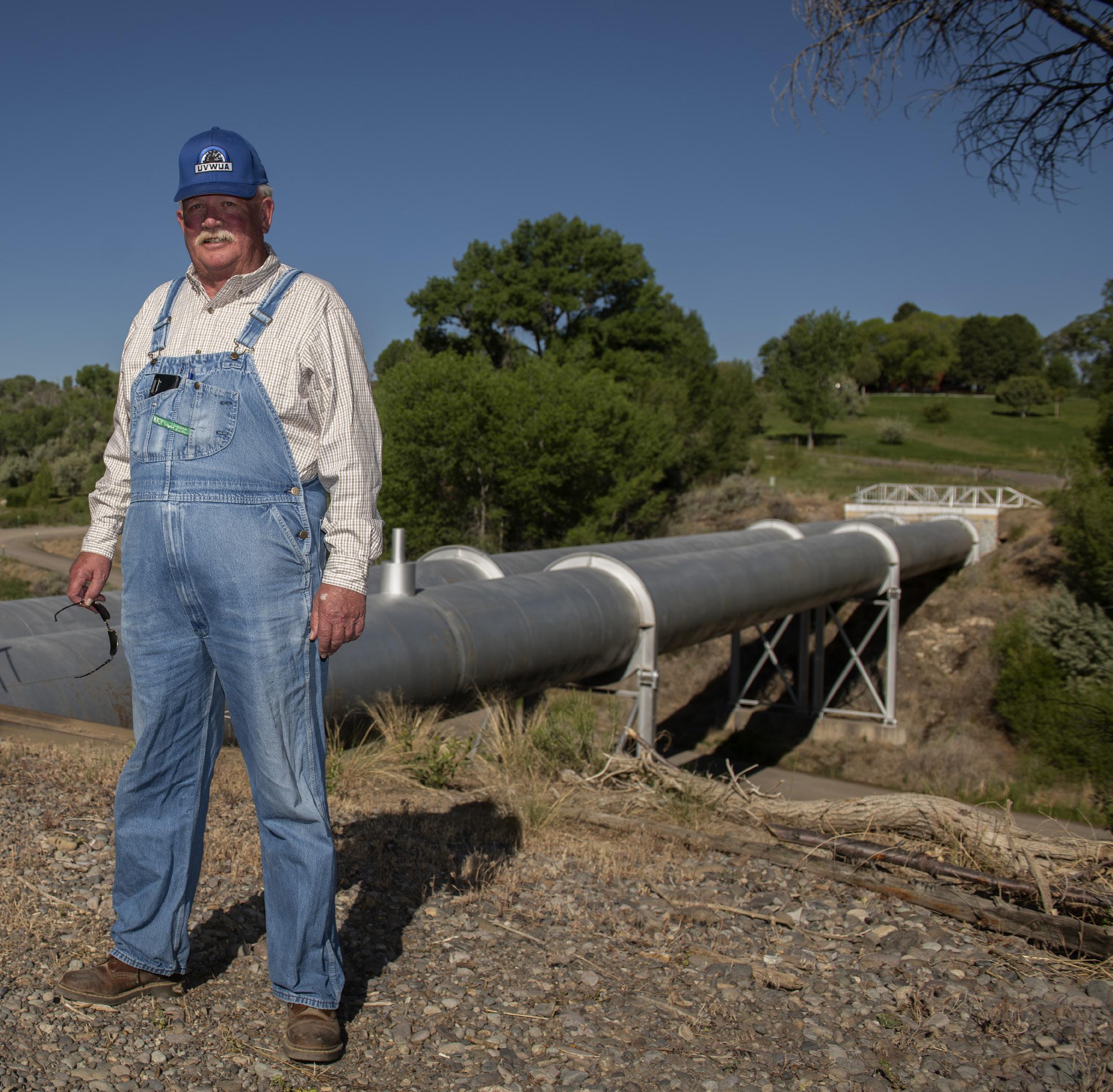 Steve Anderson, manager of the Uncompahgre Valley Water Users Association (UVWUA), stands beside a pipeline southwest of Montrose, the “twin tubes,” part of the Montrose and Delta Canal. Originally built in the early 1900s, the tubes were updated in the 1960s. Recently, the UVWUA cut air vents into the tubes and increased the capacity of the flume which, along with the entire canal, carries more than 500 cubic feet per second.