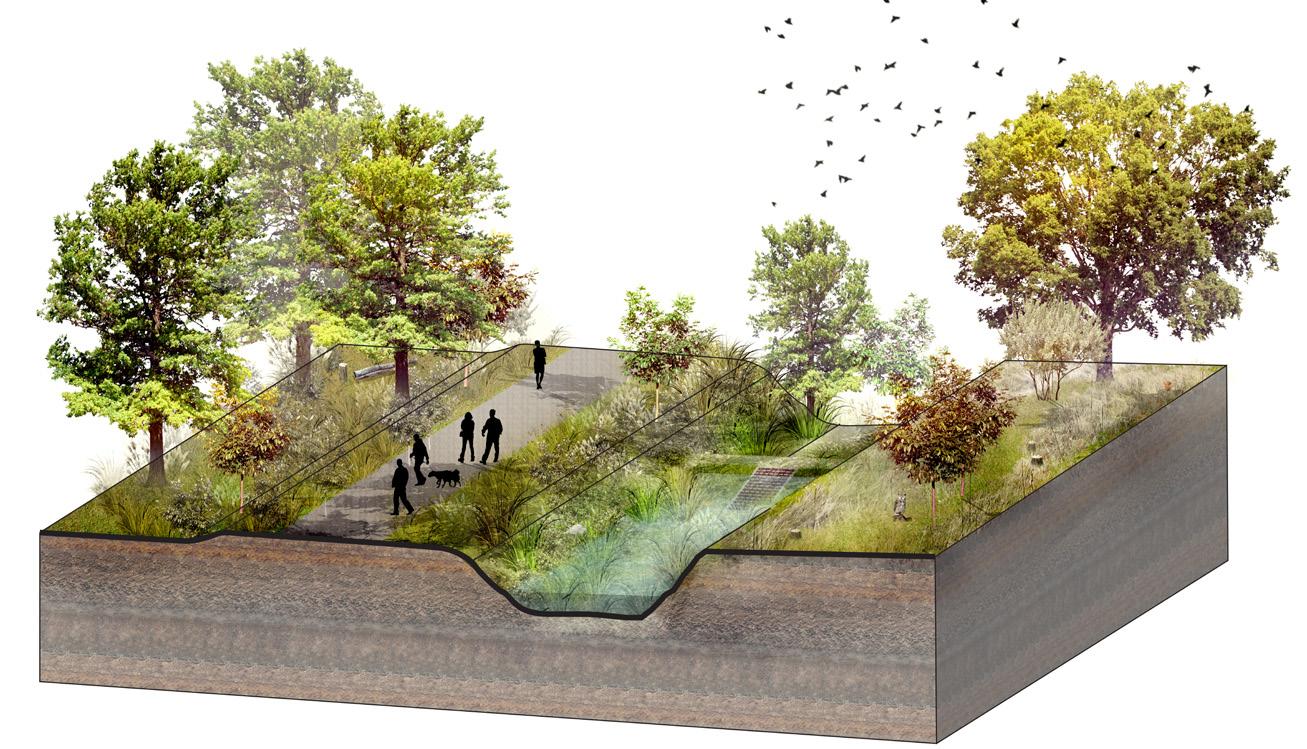 A rendering of the High Line Canal shows a flourishing future, with people recreating along the greenway and the canal itself transformed into a green infrastructure system to manage stormwater quality.