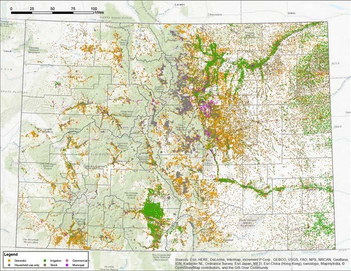 Domestic groundwater use occurs throughout the state but wells for irrigation, municipal and commercial use are most concentrated in the Denver Basin, High Plains Aquifer, San Luis Aquifer, and South Platte and