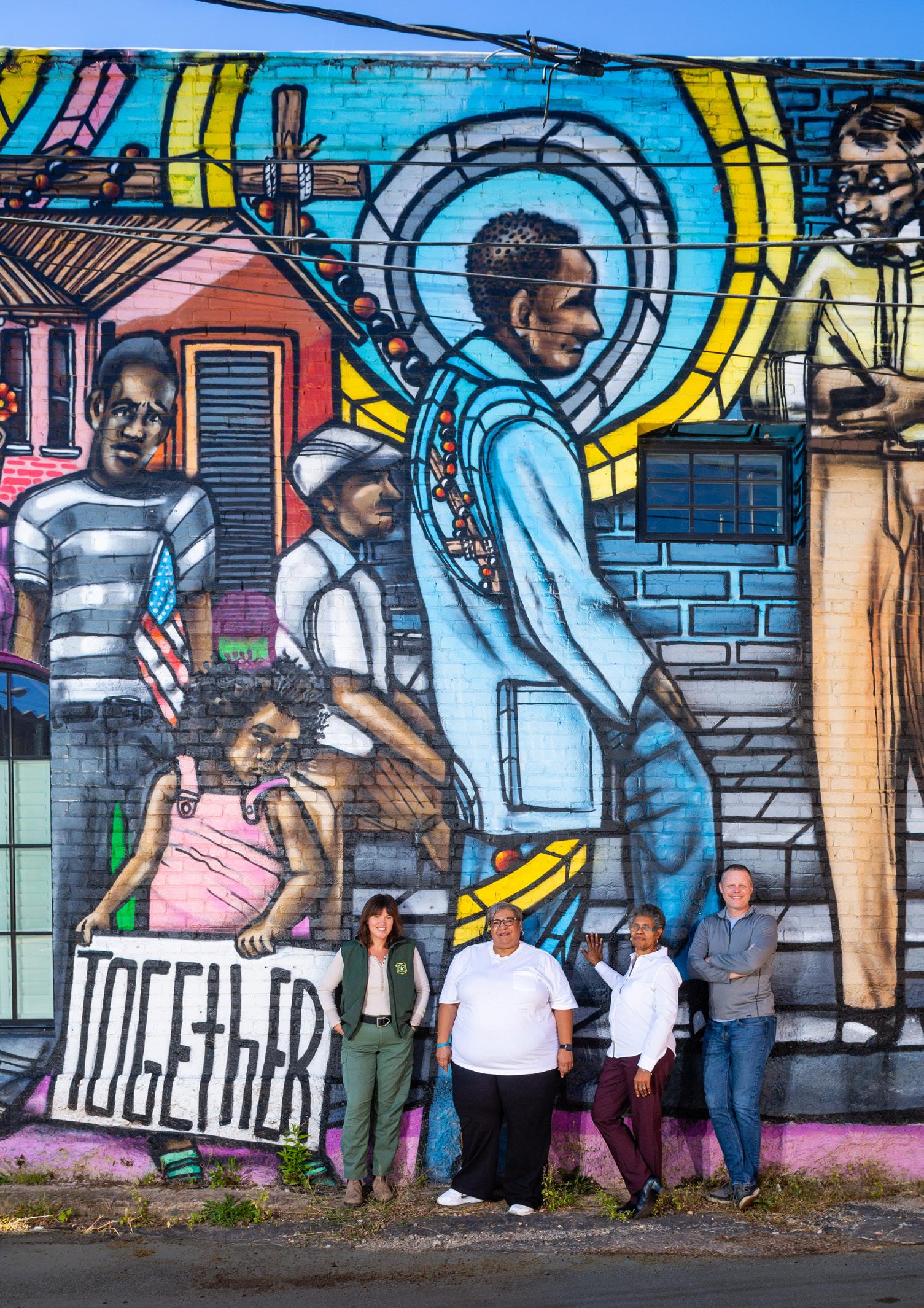 Grandfather Ranger District; Lavita Logan, People on the Move of Old Fort; Stephanie Swepson-Twitty, Eagle Market Streets Development Corporation; Jason McDougald, G5 Trail Collective & Camp Grier. Photo by Michael Oppenheim; Albert Joyner, Sr. mural by Don Rimx