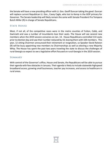 Most, if not all, of the competitive races were in the metro counties of Fulton, Cobb, and Gwinnett and saw a number of incumbents lose their seats. The House will see several new members when the 2019 session convenes on Jan. 14. House Republicans controlled 114 seats prior to election day and saw their number reduced by 10, leaving them with 104 members. This year, 12 sitting Chairmen announced their retirement or resignation, so Speaker David Ralston (R) will be busy appointing new members to Chairmanships as well as electing a new Majority Whip. The House has spent the past two years traveling the state to discuss the challenges of rural Georgia so expect to see a legislative effort focused on rural Georgia in the 2019 session. Summary