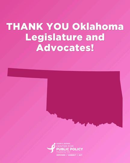 Susan G. Komen had groundbreaking victories for breast cancer care in Oklahoma this session They secured the passage of SB 109, mandating insurance coverage without cost-sharing for genetic testing and counseling for those at increased risk of breast cancer. They also championed HB 1389, which guarantees no cost-sharing for medically necessary diagnostic breast imaging - including MRIs, ultrasounds and diagnostic mammograms - and successfully led the veto override to make it law These milestones position Oklahoma as the first state in the nation to enact the most comprehensive breast cancer coverage protections. Our Oklahoma team was proud to support this important work every step of the way