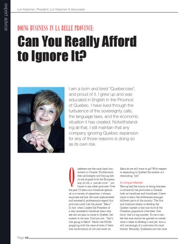 Can You Really Afford to Ignore It? I am a born and bred “Quebecoise”, and proud of it. I grew up and was educated in English in the Province of Quebec. I have lived through the turbulence of the sovereignty calls, the language laws, and the economic situation it has created. Notwithstanding all that, I still maintain that any company ignoring Quebec expansion for any of those reasons is doing so as its own risk.