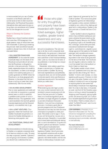 sonal, these are all governed by the Civil Code of Quebec. This voluminous piece of legislation governs all relationships and imposes in every contract whether it is stated or not, a duty of fair dealing and good faith in relationships. Quebec is the only province in Canada that has a Civil Code. Lastly, Quebec’s security legislation while it has a different mechanism and name, achieves the same results as the Personal Property Security Act (PPSA), by granting a right in all movable property. Although, unlike other provinces, commercial landlords have the legal right to—and always do—register a prior charge against all the assets on the leased premises, both movable and immovable. The landlord’s charge is generally equivalent to the value of the gross rent for the term of the lease. The franchisor can still register a security interest, but it will be ranked 2nd to the landlord, or third if there is a bank loan. The Quebec market is both vibrant and vital. Quebecers love to try new concepts and the idea of being the “first in Quebec” to have a new concept, is a very appealing selling point. Contrary to what you see in the press, Quebec is not in the middle of a hostile civil war on language or anything else for that matter that should keep a franchisor from expanding here. On a day to day basis, it’s business as usual; one third of the Canadian population is willing to reward businesses by shopping more frequently, paying higher prices, and remaining loyal, all in return for a valuable experience and good value for the dollar. There’s a reason why it’s called “La Belle Province”, and it’s a lot closer than Mars! LORI KARPMAN is President of Lori