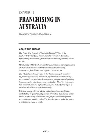 About the Author The Franchise Council of Australia Limited (FCA) is the peak body for the $171 billion franchise sector in Australia, representing franchisees, franchisors and service providers to the sector. Membership of the FCA is voluntary, and open to any organisation or individual involved in the franchise sector, including franchisors, franchisees, and suppliers to the sector. The FCA strives to add value to the businesses of its members by providing advocacy, education, information and networking services and opportunities that support a prosperous and growing franchise sector which represent good value. The FCA recognises that its members have different needs, and that different types of members should co-exist harmoniously. Whether we are offering advice on best practice franchising, contributing to government policies, promoting franchising in the media or providing educational and professional development services to our members, the FCA does its part to make the sector a sustainable place to work.