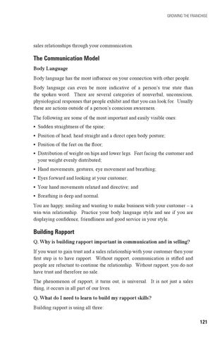 The Communication Model Body Language Body language has the most influence on your connection with other people. Body language can even be more indicative of a person’s true state than the spoken word. There are several categories of nonverbal, unconscious, physiological responses that people exhibit and that you can look for. Usually these are actions outside of a person’s conscious awareness. The following are some of the most important and easily visible ones: • Sudden straightness of the spine; • Position of head, head straight and a direct open body posture; • Position of the feet on the floor; • Distribution of weight on hips and lower legs. Feet facing the customer and your weight evenly distributed; • Hand movements, gestures, eye movement and breathing; • Eyes forward and looking at your customer; • Your hand movements relaxed and directive; and • Breathing is deep and normal. You are happy, smiling and wanting to make business with your customer – a win-win relationship. Practice your body language style and see if you are displaying confidence, friendliness and good service in your style.