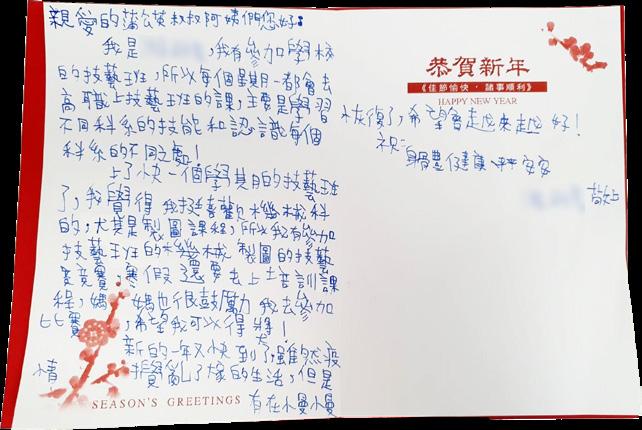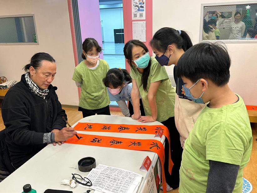 2022年末,擅長書法藝術的超群老師與 永中老師,也共同於分館大筆揮毫,分 享對於新年的祝福。一張張的春聯,蘊 含著濃濃的愛與關懷,希望每個受扶助 的家庭,在來年裡都平安如意。