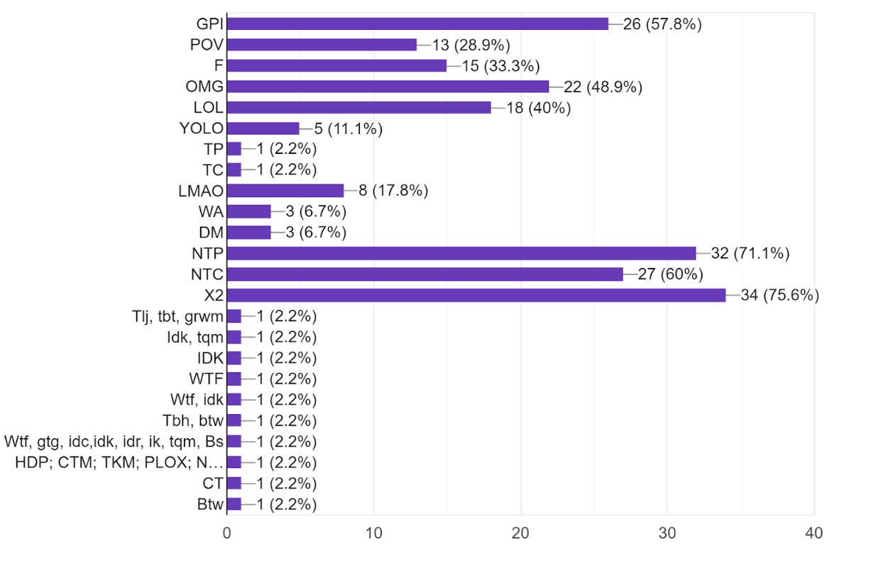 use abbreviations, while 26.7% use them almost always, with common expressions including“X2”(75.6%),“NTP”(71.1%),and “OMG” (48.9%). These are primarily used in informal contexts, such as chats with friends (93.3%) and comments on posts (48.9%), drivenbysimplicity,speed,andsocialtrends.