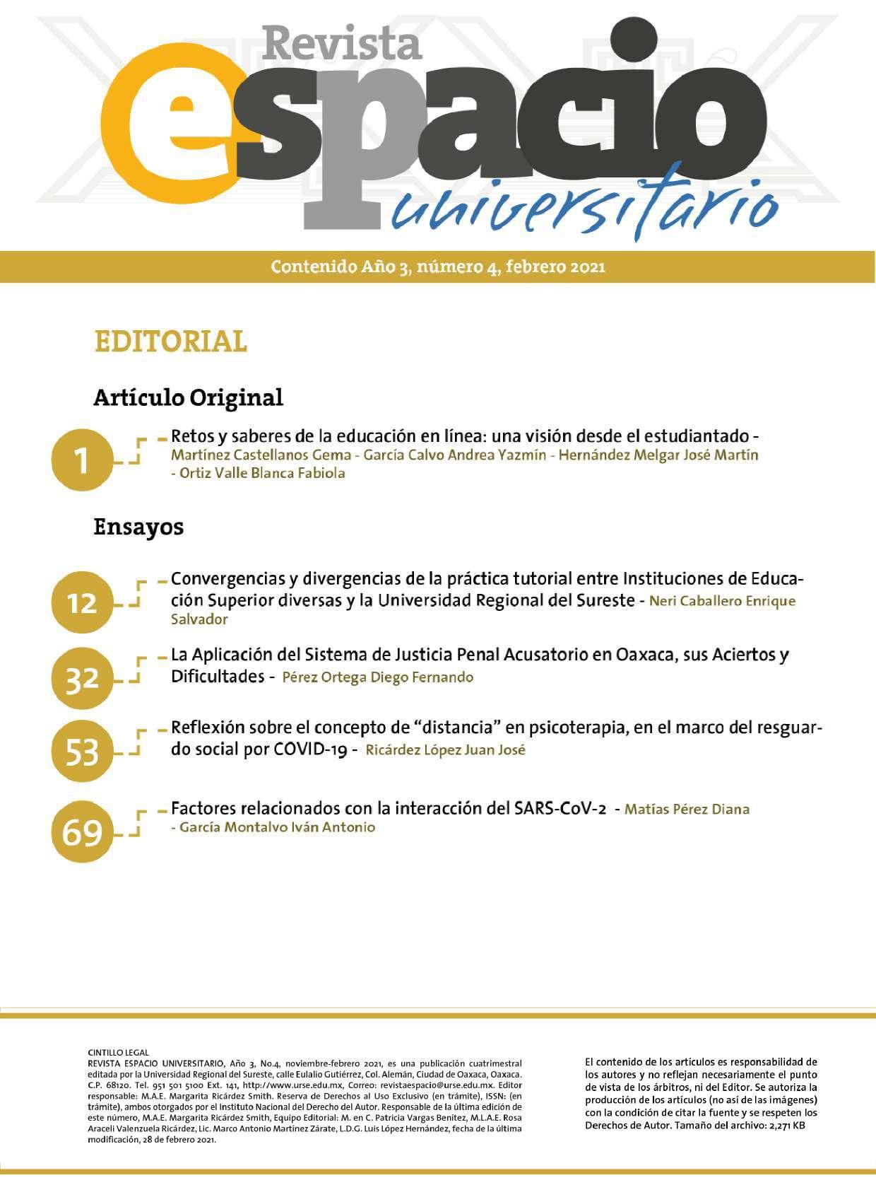 En este número 4 de la Revista Espacio se abordan temáticas de interés actual para nuestra sociedadysus nuevos estilos devidaqueprevalecencon el findepriorizarlasalud y el bienestar colectivo. Se analizan los Aciertos y Dificultades de la aplicación del Sistema de Justicia Penal Acusatorio en el Estado, El impacto de la tecnología aplicada en diferentes aspectos de nuestra vida también es un tema de discernimiento que no nos deja indiferentes. Conocer la percepción que tienen nuestros estudiantes sobre la educación a distancia, nos permite tomar medidas para una educación planeada de acorde a las necesidades de nuestros alumnos, las convergencias y divergencias de la práctica tutorial abordada en uno de los ensayos de este número, estoy segura será de interés para quienes estamos inmersos en el ambiente educativo .