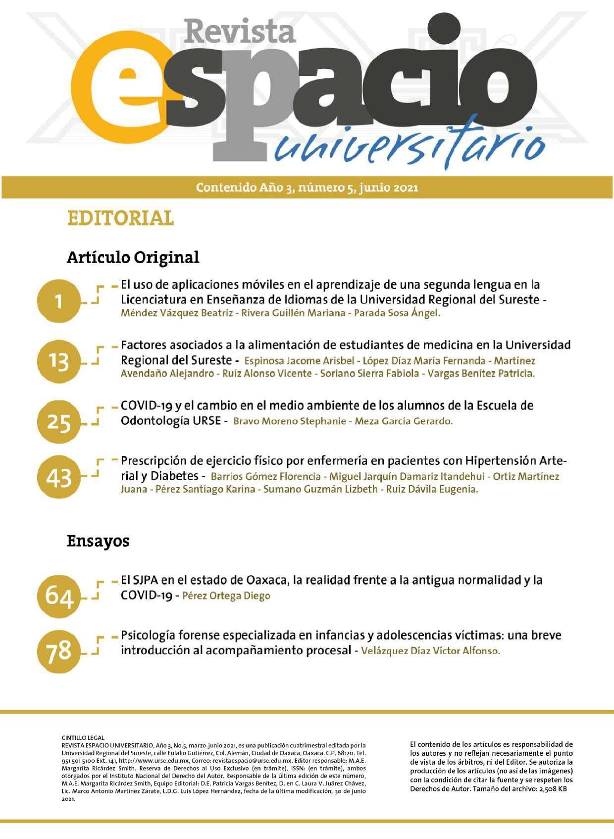 Enlaediciónnúmero5delaRevistaEspacioUniversitarioseabordantemáticasdiversasdeinterés para la sociedad en general; como el uso de las aplicaciones móviles para el apoyo del aprendizaje en línea. Tópicos de interés para la sociedad estudiantil como los factores que se asocian a la mala alimentación de los estudiantes a nivel licenciatura, los cuales van aumentando conforme avanzan en sus años de estudios, por otro lado, se manifiestan las opiniones de los estudiantes con respecto a la COVID-19 y los cambios que trae consigo a nivel social, ambiental e incluso emocional.