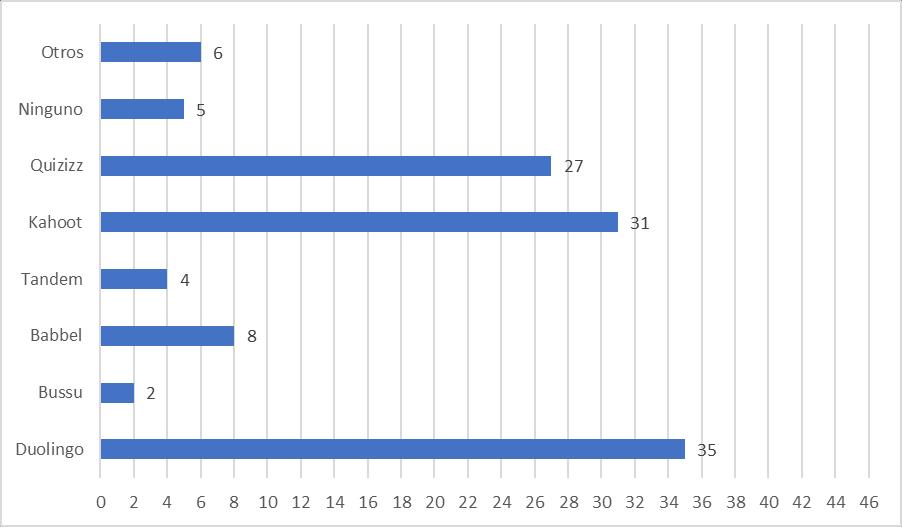 alumnos han utilizado otras aplicaciones educativas que no se mencionaron en esta pregunta. Los 46 estudiantes encuestados pudieron elegir más de una respuesta en esta pregunta, que fueron: Duolingo © 35