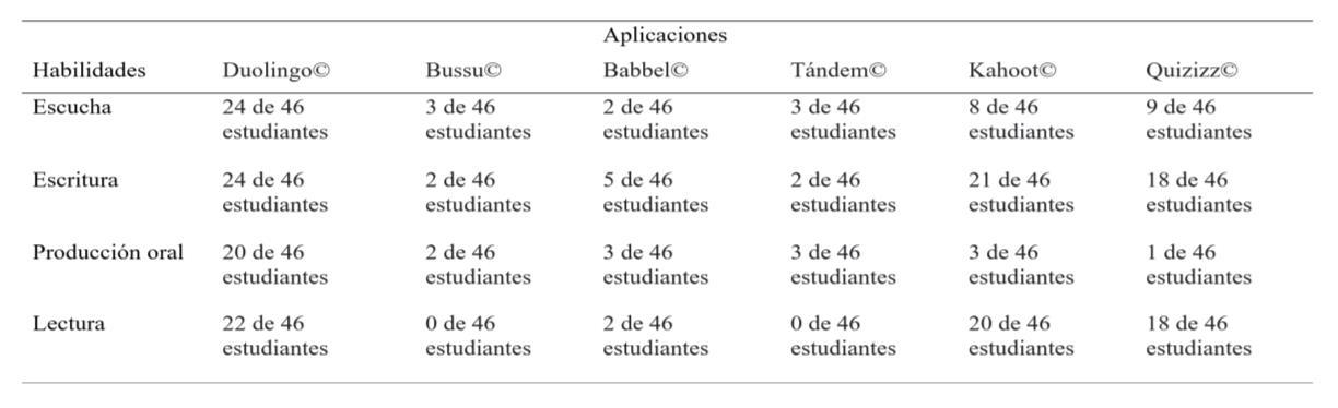 Latabla1 muestracuáles han sido las habilidades que los alumnos han encontrado en algunas aplicaciones educativas. Los 46 estudiantes encuestados eligieron más deuna habilidad, los resultados mostraron a Duolingo © como la aplicación más usada, por lo cual con respecto a la habilidad de escucha y escritura 24 alumnos señalaron poner en práctica esa habilidad, en la expresión oral 20 estudiantes y en la habilidad de lectura 22 estudiantes.