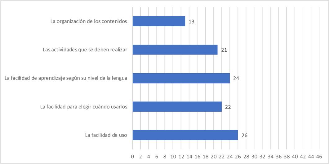facilidad de uso fue seleccionada por 26 estudiantes (56.5 %), la facilidad para elegir cuándo usarlos 22 estudiantes (47.8 %), la facilidad de aprendizaje según su nivel de la lengua 24 alumnos (52.2 %), las actividades