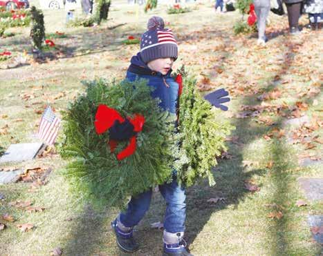 Noah Muckelvaney, 7, of Shelby Township, carries a few wreaths to be placed on the graves of veterans at Resurrection Cemetery in Clinton Township. The veteran tributes were part of Wreaths Across America’s event on Dec. 14.