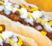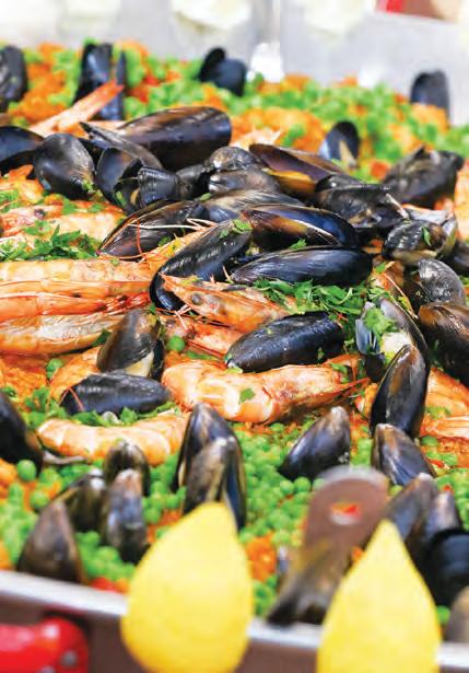 For Taher’s paella, lemon wedges garnished the edge of the pan, with giant farmraised shrimp from India and mussels from Canada occupying prominent placement in the center, where they stood out against a backdrop of bright green peas and fiery orange sauce.