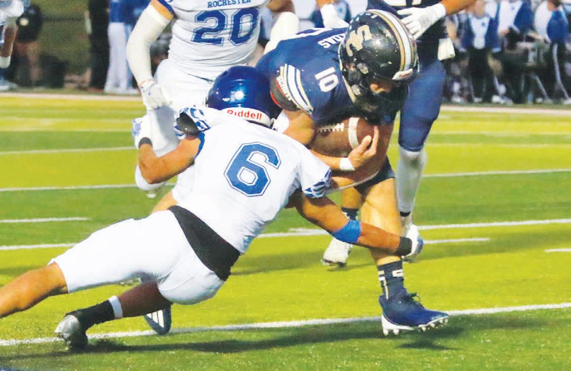 ABOVE: Rochester Hills Stoney Creek sophomore Brosie Telegadas lowers his shoulder against Rochester junior Devin Grabke. Stoney Creek would defeat Rochester 22-21 Oct. 4 at Stoney Creek High School, improving the Cougars’ all-time record against the Falcons to 11-7. LEFT: Rochester Hills Stoney Creek junior Jack Fredenberg makes a leaping touchdown grab in the back of the endzone. With the win, Stoney Creek moves to 3-3 on the season and third in the Oakland Activities Association standings while Rochester drops to 2-4 and fourth in the standings.