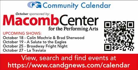 Speaker Series: Hear from bestselling authors and thought leaders, topics are “Maybe You Should Talk To Someone: Examining the Truths and Fictions we Tell Ourselves” (2 p.m. Oct. 22), “A Navajo Investigator’s Search for the Unexplained” (7 p.m. Nov. 7), “On Childhood Migration from Central America” (4 p.m. Nov. 14) and “Native Rights and Culture in Fiction” (7 p.m. Nov. 20), Madison Heights Public Library, 240 W. 13 Mile Road, registration required, (248) 588-7763, libraryc.org/mhlibrary/upcoming Downtown BOO!kley: Fall-themed events include Ghost Chase (Oct. 18), Trick-or-Treat Stroll & Monster Mash (Oct. 26) and Vampire Blood Drive (Oct. 29), various locations in Berkley, facebook.com/DowntownBerkley