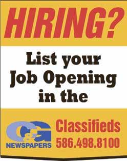 Classifieds: For ad rates (586) 498-8100 Legals and Obits: (586) 498-1099 Automotive Advertising: Louise Millar | (586) 498-1054 | lmillar@candgnews.com