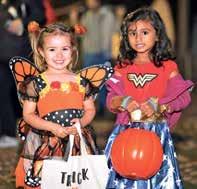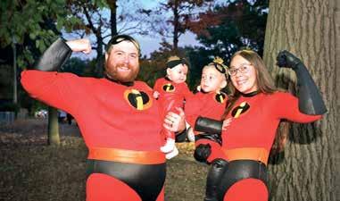 ABOVE: The Brian family, of Roseville — Tiffany and Caleb and children Ellie, 4 months, and Lehr, 3 — dress as the Incredibles during the Trick or Treat Trail at Clawson City Park Oct. 19. LEFT: Joshua Wilde, magician and owner of Clawson’s Wunderground Magic Shop, entertains trick-or-treaters waiting in line for activities during the rainy day. Amelia Abila, 8; Connie Seibt and daughter Ainsley, 8, all of Troy, watch the magic. TOP RIGHT: Luna Simonsen-Gleason, 3, of Clawson, dresses as a butterfly and Aarna Challa, 4, of Troy, dresses as Wonder Woman. RIGHT: Trick-or-treaters walk through the trees to reach the trail.