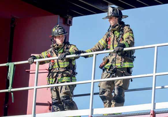 ABOVE: Southfield firefighters stand at the top of the training structure after clearing the building as part of the simulation.