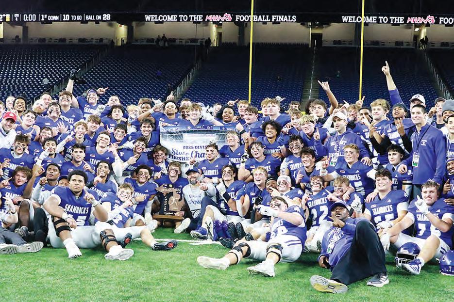 ABOVE: Players and coaches pose with the MHSAA Division 1 state championship trophy after the team’s win.