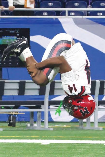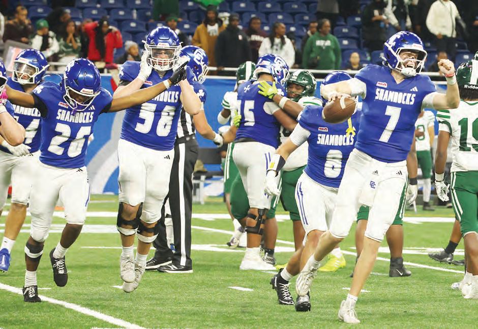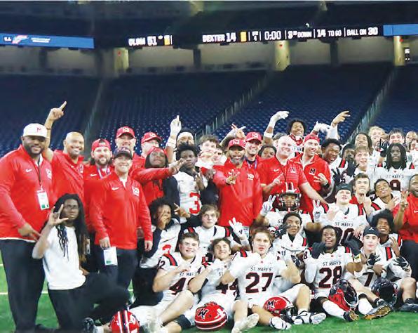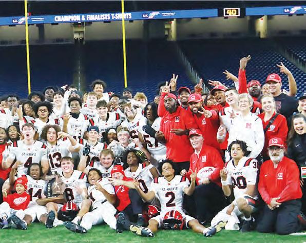 ABOVE: The Orchard Lake St. Mary’s football team celebrates Nov. 28 at Ford Field in Detroit with the MHSAA Division 2 trophy after its 51-14 win over Dexter.